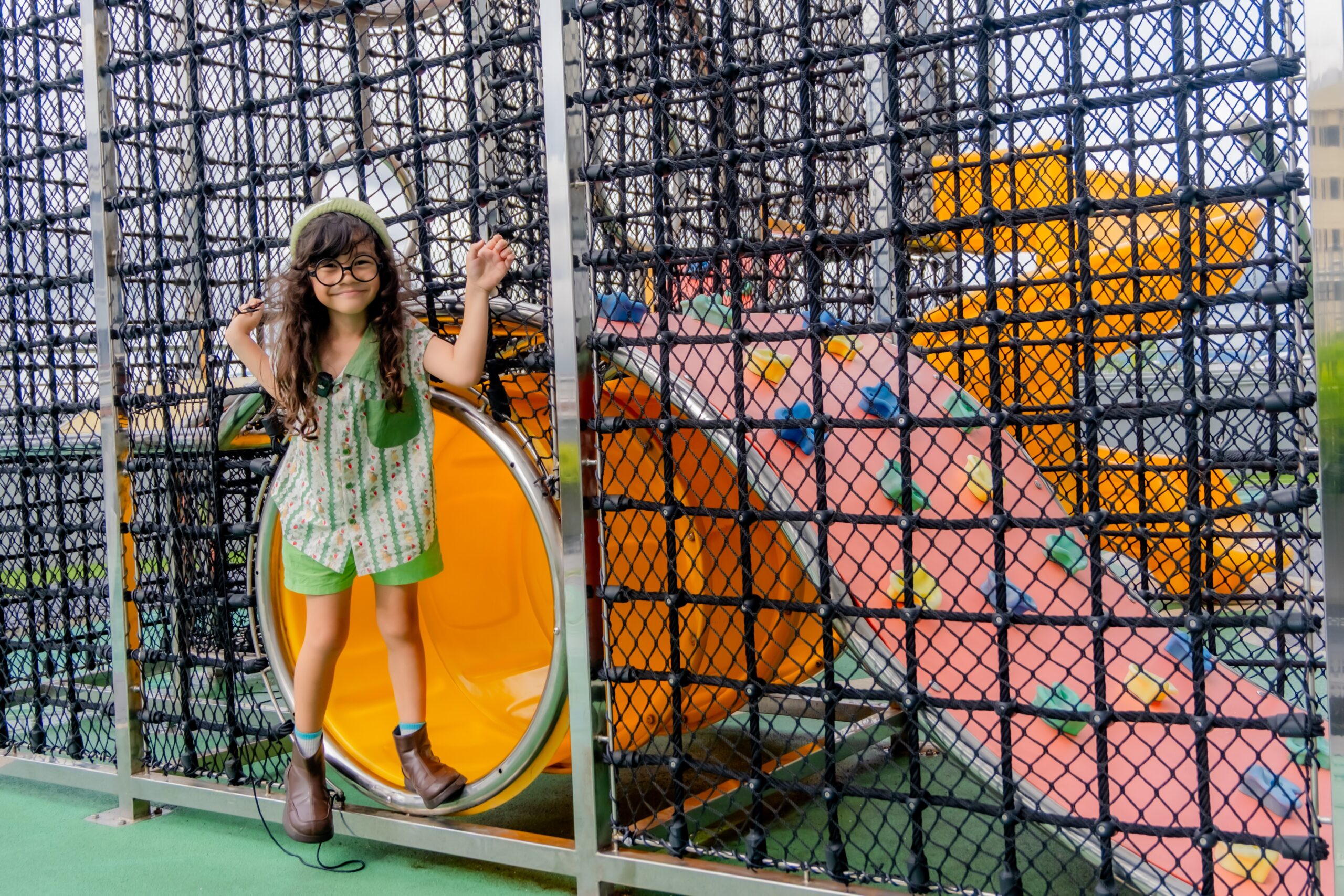 Our dedicated family space is located outdoors is spread out over a large grass area making it safe for your little ones to run, and stay active, climb the spider nets and slide down the large slide or hideout in the tunnels.